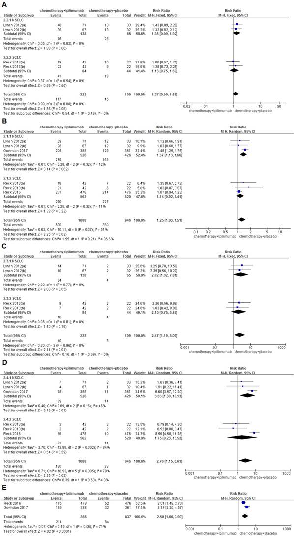 In summary, chemotherapy combined with ipilimumab immunotherapy cannot improve the OS, ORR, DCR of patients with lung cancer (NSCLC, ED-SCLC) compared with chemotherapy alone, but it can improve the patient's 6-month/1-year PFS and 6-month-irPFS; a subgroup analysis suggests that 1-year PFS is more improved in patients with advanced or recurrent NSCLC in the chemotherapy plus ipilimumab immunotherapy group. However, due to the addition of ipilimumab, the tr-AEs, ir-AEs, serious AEs and AE-related discontinuation are relatively higher in this group than in the chemotherapy only group, in which the immune-related toxicities are more apparent, and the quality of the patient's life has been affected. We hope this meta-analysis can play a role in evidence-based medicine and clinical work, but we must have a dialectical view of the results. Nevertheless, for further research and exploration, we need additional larger, multi-center studies that include more detailed types of tumors and that strictly control the type and dosage of chemotherapeutics.
