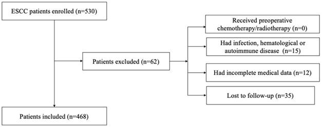 We retrospectively reviewed a database of medical records of 530 consecutive patients with surgically resected ESCC between 2005 and 2008 at the department of thoracic surgery, National Cancer Center/Cancer Hospital, Chinese Academy of Medical Sciences, and Peking Union Medical College. The inclusion criteria were as follows: (1) curative esophagectomy with R0 resection; (2) histologically confirmed ESCC; 3) preoperative serum laboratory results were obtained within five days before surgery. The exclusion criteria were as follows: (1) if patients received preoperative chemotherapy/radiotherapy; (2) if they had acute/chronic infection or (3) if they had hematological or autoimmune disease; (4) if they died during the perioperative period; (5) if they lacked detailed clinical information and follow-up information. Totally, 62 patients were excluded from this study. The whole enrollment process was clearly shown in Figure 1. Among these patients, 15 patients had infection, hematological or autoimmune disease; 12 patients had incomplete medical data; and 35 patients were lost to follow-up. Finally, a total of 468 patients were enrolled in the present study.