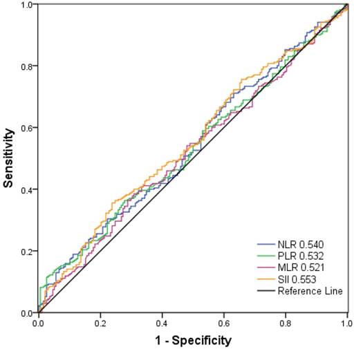 Receiver operating characteristic curve analysis for the optimal cut‐off value of SII, NLR, PLR and MLR. The areas under the curve for overall survival were 0.553, 0.540, 0.532, and 0.521 for SII, NLR, PLR and MLR, respectively.