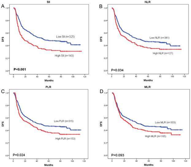 OS curves were plotted by the Kaplan-Meier method and compared using the log-rank test. High SII, NLR, PLR and MLR were associated with poor OS (p = 0.001, p = 0.033, and p = 0.027, respectively) (Figure 3A-3C) and poor DFS (p < 0.001, p = 0.034, and p = 0.024, respectively) (Figure 4A-4C). However, no significant differences were found between MLR and patients' OS (p = 0.104) (Figure 3D) and DFS (p = 0.093) (Figure 4D).