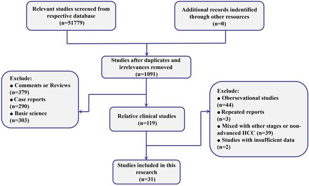 Two researchers independently reviewed the title and the abstract of each assay to select those for further screening that met following items: (1) randomized controlled trials (RCTs); (2) trials focused on targeted agents for advanced or unresectable HCC; (3) application of targeted agent was the only intervention; and (4) studies providing at least one available parameter of interests. Meanwhile, the following items were defined as exclusion criteria: (1) observational studies; (2) no available parametric data reported; (3) reviews, comments, case reports or study protocols; (4) studies focusing on basic science; (5) trials without sufficient follow-up; and (6) mixed HCC stages or repeated reports.