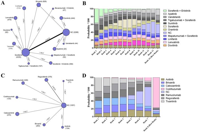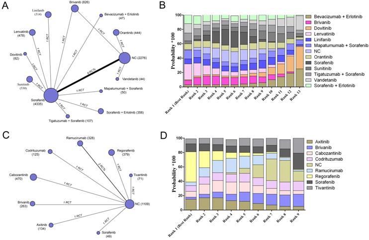 The network evaluation of included agents regarding progression-free survival. (A) Network connections of all of the included trials for patients without previous systematic treatments; (B) SUCRA values and ranks of included agents for patients without previous systematic treatments; (C) Network connections of all of the included trials for patients with previous systematic treatments; (D) SUCRA values and ranks of included agents for patients with previous systematic treatments. The numbers on the line indicate the quality of studies compared with every pair of strategies, which are also represented by the width of the lines. Additionally, the sizes of the areas of the circles indicate the respective sample sizes. NC, negative control.