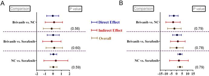 Node-splitting analysis for patients without previously systematic treatment regarding (A) overall survival and (B) adverse event.