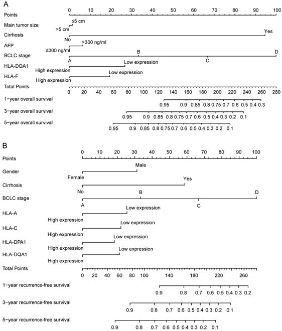 Nomograms constructed using overall survival and recurrence-free survival-related clinical factors and genes. A: Nomogram of overall survival-related genes and clinical factors; B: Nomogram of recurrence-free survival-related genes and clinical factors.