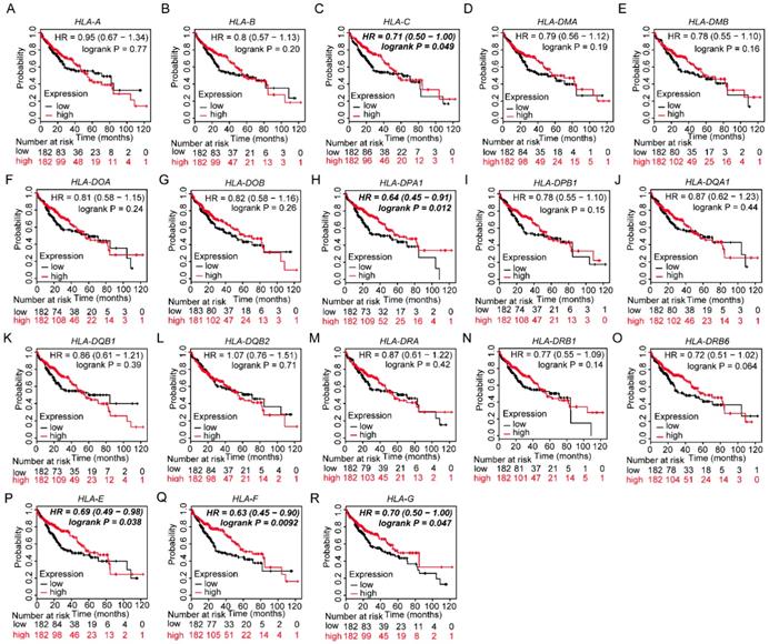 Prognostic values of HLA family members were further validated in the whole population. HLA-C, HLA-DPA1, HLA-E, HLA-F and HLA-G showed significance in OS (all P ≤ 0.05, Figure 13C, H, P-R). However, other genes did not show significance (all P > 0.05, Figure 13).