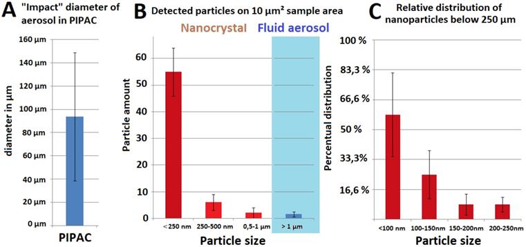 Rim formation is considered an indicator for fluid aerosol impaction with probe surfaces (Figure 4B). Particles smaller than 1 µm do not display any rim formation and must therefore have impacted as crystallized nanoparticles. The percentual distribution of particle size in relation to total particle amount was analyzed (Figure 4B) and further specified for particles <250 nm threshold (Figure 4C).