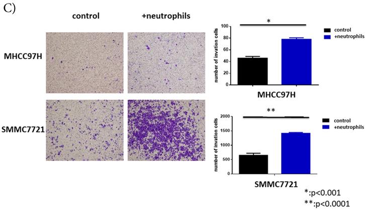 The functions of circulating neutrophils in HCC. A) Cell proliferation of HCC cell lines MHCC-97H and SMMC-7721 after 1day,2days,3days,4days and 5days cultured with or without circulating neutrophils were detected via CCK8 kit. There's no difference on cell proliferation between two groups. B) Cell migration of HCC cell lines MHCC-97H and SMMC-7721 after cultured with or without circulating neutrophils were detected by Wound-healing assays. After 48hours cultured with circulating neutrophils, the cell migration rates of MHCC-97H and SMMC-7721 were increased than control groups. C) Cell invasion assays of HCC cell lines MHCC-97H and SMMC-7721 were performed after 24hours incubation with or without circulating neutrophils, cells in purple were invasion cells. The number of invasion cells of co-cultured groups were increased than control groups.