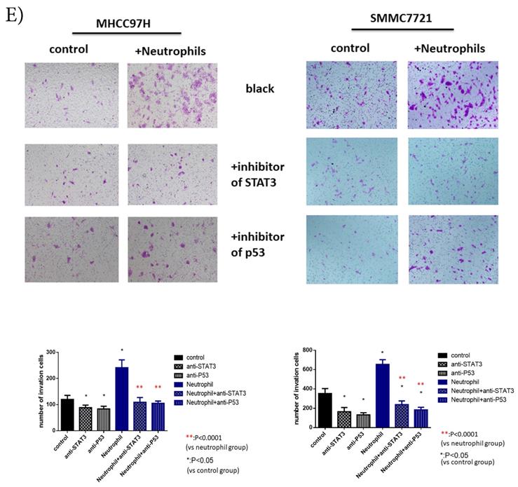 After we treated HCC cell lines with inhibitors of p53 (Pifithrin-β) and STAT3(HO-3867), we found a respective and complete reversion of the increased migration and invasion of HCC cell lines by circulating neutrophils (Fig 3C, Fig 3D, Fig 3E). These results suggested that the promotion effect on HCC cell lines by circulating neutrophils required p53 and STAT3 signaling pathways.