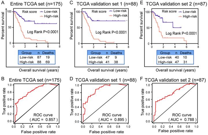 Validation of prognostic model for PC patients with Kaplan-Meier survival curves and ROC curves. Kaplan-Meier survival curves of prognostic signature for PC patients in (A) entire TCGA set (n=175), (C) TCGA test set (n=88) and (E) TCGA validation set (n=87). A two‐sided Log‐Rank P<0.05 were considered significant. ROC curves were applied to validate prognostic efficiency of prognostic biomarker for PC patients at 3 years in (B) entire TCGA set (n=175), (D) TCGA test set (n=88) and (F) TCGA validation set (n=87). Abbreviation: ROC: receiver operating characteristic.