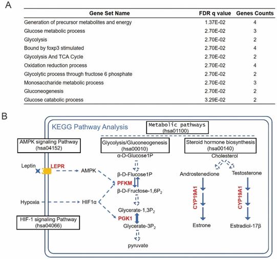 To investigate the functional mechanisms of the identified prognosis-related hub RBPs, we uploaded them to the online tool GSEA (https://www.gsea-msigdb.org/gsea/index.jsp) for functional enrichment analysis. The results strongly enriched the prognosis hub RBPs into metabolic processes, including generation of precursor metabolites and energy, glucose metabolic process, glycolysis and TCA cycle, etc (Figure 7A). The cancer-associated metabolic alterations have profound effects on gene expression, cellular differentiation and the tumor microenvironment [33]. And it has become evident that the alteration of cancer metabolism has been considered as an emerging hallmark of tumorigenesis [33]. Thus, our results indicated that these prognosis-hub RBPs might affect tongue cancer progression through regulating various metabolic processes. In order to determine the detailed role of the prognosis hub RBPs, we further uploaded these prognosis-related hub RBP genes to the online tool KEGG pathway analysis (https://www.genome.jp/kegg/tool/map_pathway2.html). KEGG analysis respectively enriched LEPR, PFKM, PGK1, and CYP19A1 in AMPK signaling pathway, HIF-1 signaling pathway, Glycolysis/Gluconeogenesis and steroid hormone biosynthesis (Figure 7B). AMPK, HIF-1 signaling pathways and Glucose metabolism are widely recognized and heavily pursued for treatment of metabolic diseases, such as a variety of cancers [34-37]. Previous reports have demonstrated that the increased hormones occurred as cause of tongue cancer progression and revealed the components of the steroid biosynthetic pathways can be considered to be cancer biomarkers [38-41]. Thus, the enrichment of LEPR, PFKM, PGK1, and CYP19A1 in the aforementioned pathways suggests these prhRBPs as potential therapeutic targets.