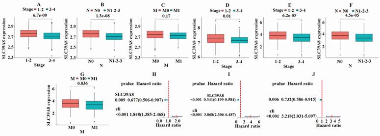 Results of correlation analysis between the expression of SLC39A8 and clinical classification indicators. In the GSE39582 dataset, a significant difference was noted in the expression of SLC39A8 among patients with different stages (A) and N-stages (B), but not M-stage (C). The GSE17538 dataset indicated significant variations (P<0.05) in the expression of SLC39A8 between patients at early and late stages (D). In the TCGA dataset, a significant disparity was observed in the expression of SLC39A8 across patients with varying stages (E), N-stages (F), and M-stage (G). Single factor independent prognostic analysis showed that SLC39A8 could serve as an independent prognostic factor for CRC (H-J).